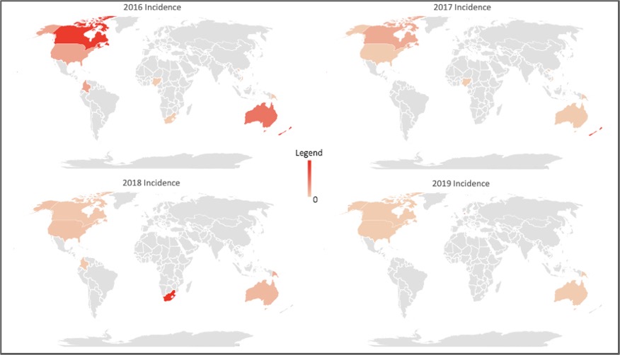 Notes: Annual Prevalence was based on population estimates for the given country for the year. In addition, some countries had reported case numbers in one year and did not have reported cases in another. As the legend indicates, the darker the hue of red, the higher the annual prevalence, but varying depending on the year. The following ranges of prevalence are reported below: For 2016, the prevalence ranges from 1.6 to 0.33 per 100,000. For 2017, the prevalence ranges from 28.7 to 0.02 per 100,000. For 2018, the prevalence ranges from 1.5 to 0.03 per 100,000. In 2019, the prevalence ranges from 22.5 to 0.01 per 100,000. The countries in grey data were not gathered for comparison.