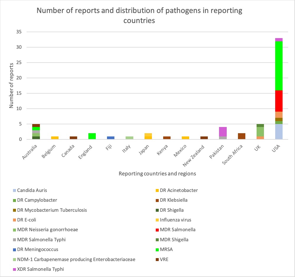 There was a total of 60 reports on AMR outbreaks between August 2016 and March 2020. We detected AMR outbreak reports from 14 countries and regions. The distribution of reporting is shown in figure 1. The most frequently reporting country was the United States of America, with a total of 33 reports. The most common reported pathogen was MRSA, followed by drug-resistant Salmonella which includes Salmonella Typhi and non-Typhi Salmonella serovars.