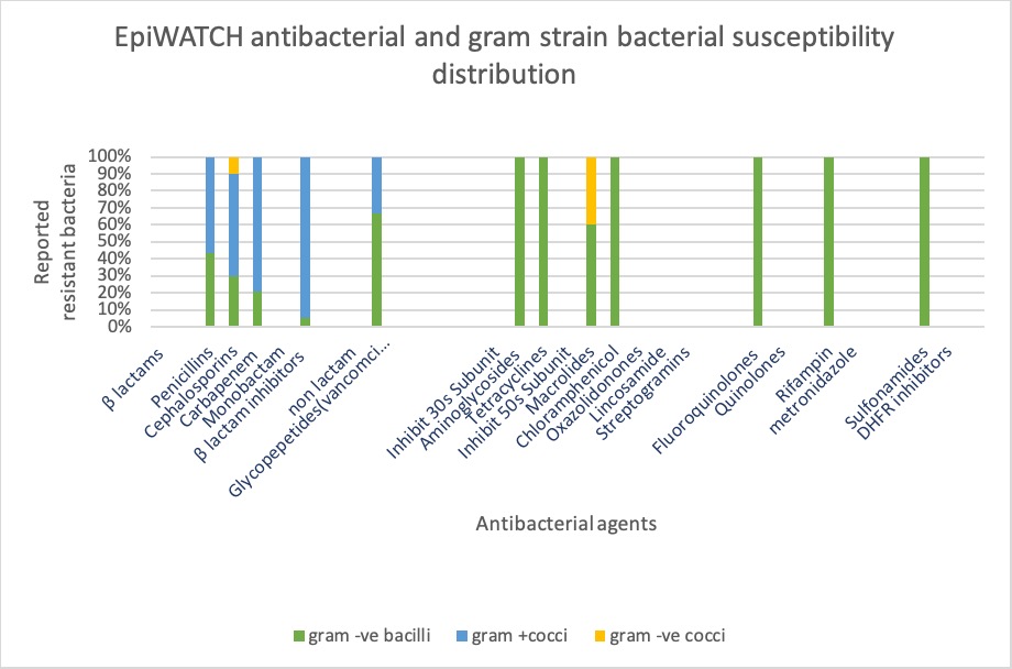 Corresponding to EpiWATCH data, there was predominance of pathogenic resistance towards the cell wall inhibitor class of antibiotics in GLASS and none of the Staphylococcus isolates from the world were more than 75% resistant to antibiotics, highlighting that gram-positive cocci infections were not as lethal as the gram-negative bacilli infections. This result is consistent with the EpiWATCH findings.