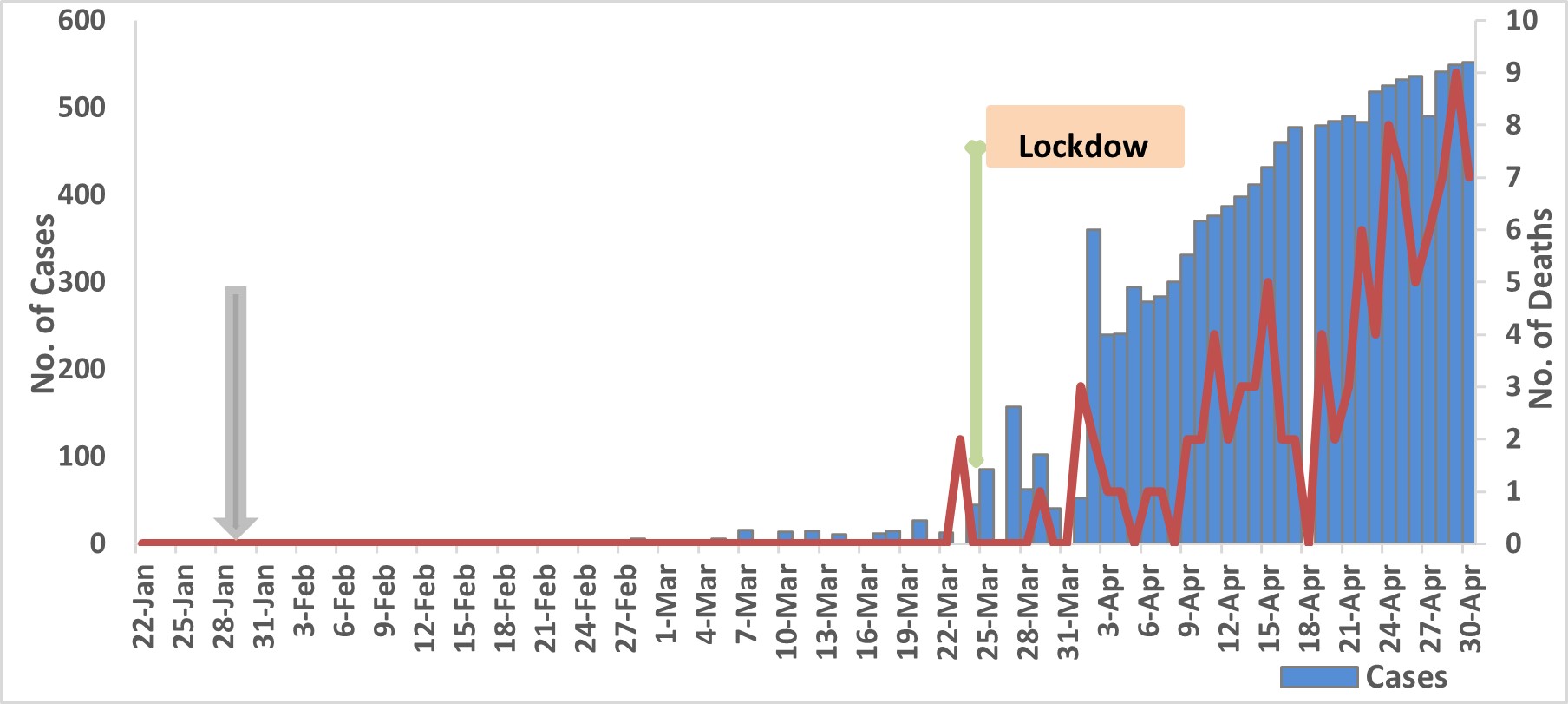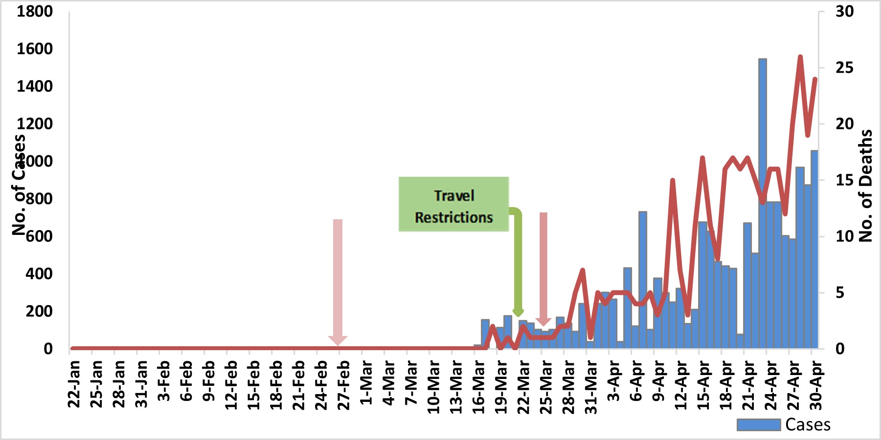 Trend of COVID-19 cases and deaths in Pakistan till 30th April 2020.