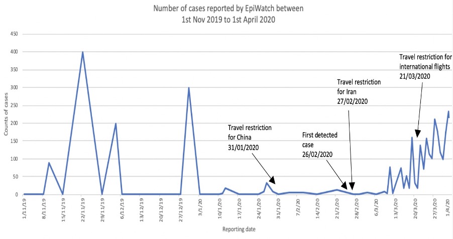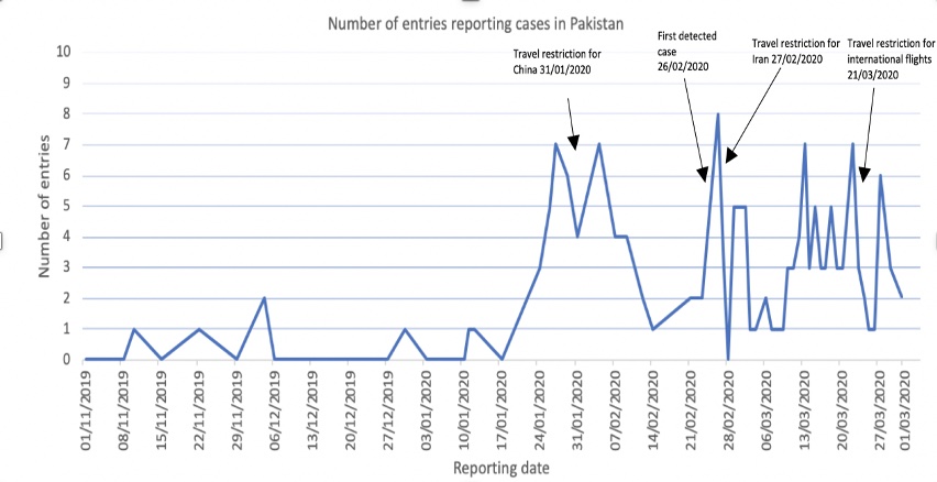The study analyses and identifies the early signs of COVID-19 in Pakistan through data extracted from EpiWATCH using the search word ‘pneumonia of unknown cause’ to compare the disease trends before and after the notification of first official case of COVID-19 in Pakistan. A significant rise in reports of cases of pneumonia of unknown origin was observed by early January 2020, a month and a half before the first 2 cases of COVID-19 were notified in Pakistan on 26 February 2020. Moreover, from the beginning of March 2020, an increase in number of reports of cases was captured by EpiWATCH, which is consistent with the growing number of cases of COVID-19 in Pakistan. Pneumonia is the second-leading cause of death among children under 5 years in Pakistan, and the majority of the news reports for cases of pneumonia in 2019 were of children (Bashir et al., 2016). Suspected individuals with a recent travel history to and from China were immediately quarantined and tested but were later declared as cases of pneumonia. Interestingly, Pakistan acquired their initial testing kits for COVID-19 from China in early February 2020 which could be a possible reason for the delay in early diagnosis of suspected cases (Nafees & Khan, 2020). Furthermore, there was a gradual increase in reporting of cases after the first two cases were diagnosed on 26 February 2020. However, the cases started to increase sharply after 6 March 2020 until 1 April 2020.