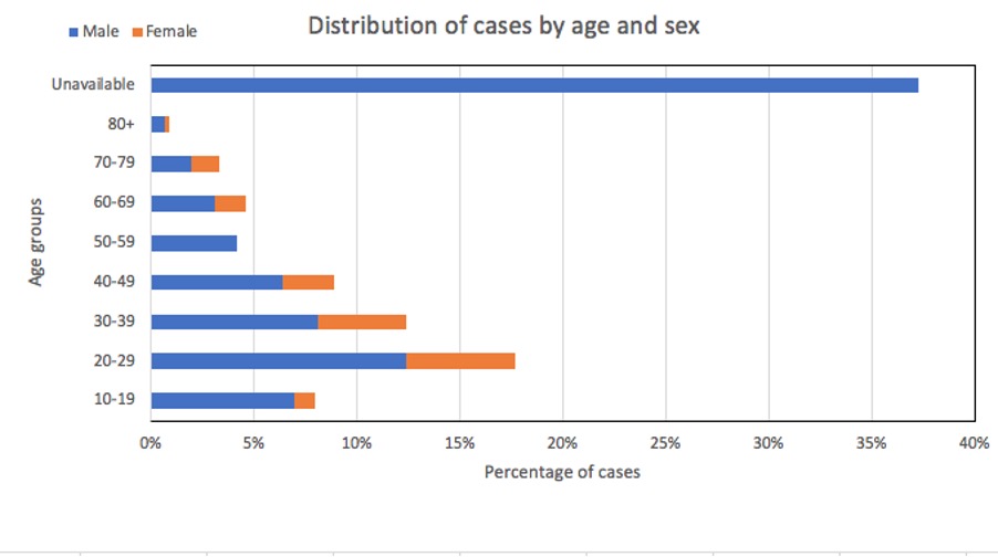 As seen in Figure 3, the male population has higher proportion of total cases of pneumonia of unknown origin than females throughout all the age groups. In terms of age distribution, the greatest number of cases are reported among individuals aged 20-29 years, while the age bracket of 80+ years has the lowest number of cases for both males and females. The age and gender information of the remaining 38% of the cases was not available in the entries.