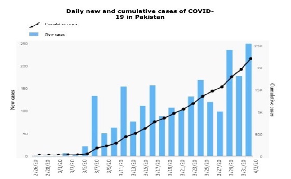 New cases and cumulative cases of COVID-19 in Pakistan from 26 February 2020 until 1 April 2020 (Government of Pakistan, 2020).