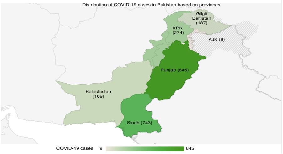 Geographical distribution of COVID-19 cases by provinces in Pakistan between 26 February – 1 April 2020 (Data Source - (Government of Pakistan, 2020)).