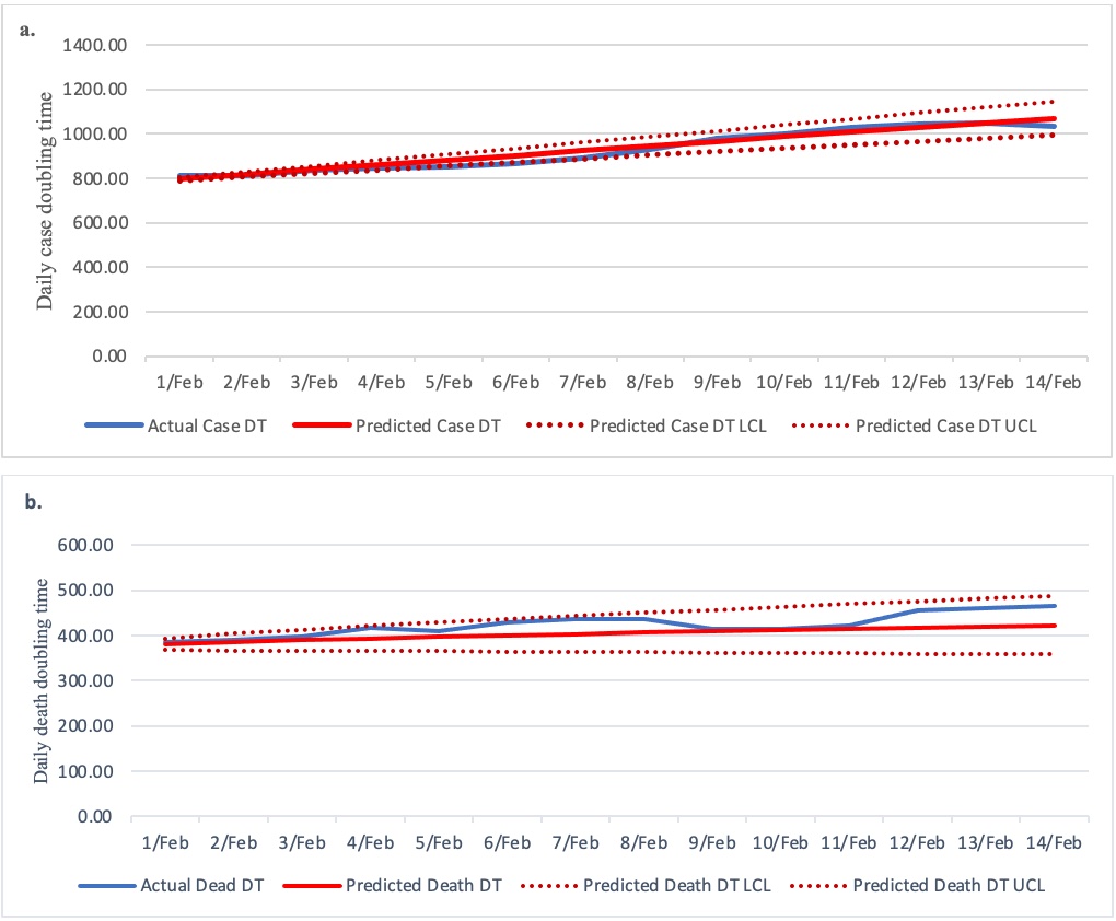 To check the accuracy and validity of our prediction model, we performed a short-term 14 days [1 – 14 February, 2021] prediction of the doubling time for daily confirmed COVID-19 cases and deaths. Then, the predicted data with 95% confidence interval for both COVID-19 new cases and deaths were compared with the actual [calculated] doubling time data of the same time frame. ARIMA (1, 1, 1) (0, 0, 0) and ARIMA (0, 1, 0) (0, 0, 0) models were used as the best fitted model for cases and deaths respectively. The prediction models were selected following the time series best model selection criteria (22-24). Although, the actual death doubling time showed fluctuation with predicted doubling time [Figure 1.b], the predicted doubling time for daily confirmed new cases showed good fit [Figure 1.a], where the actual doubling time falls in the 95% confidence limit of the predicted doubling time which ensures the accuracy and validity of our prediction model [Figure 1].