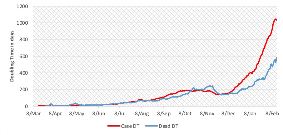 Trends of doubling time for daily confirmed new COVID-19 cases from 15, March, 2020 to 14 February, 2021 and deaths from 25 March, 2020 to 14 February, 2021 in Bangladesh.