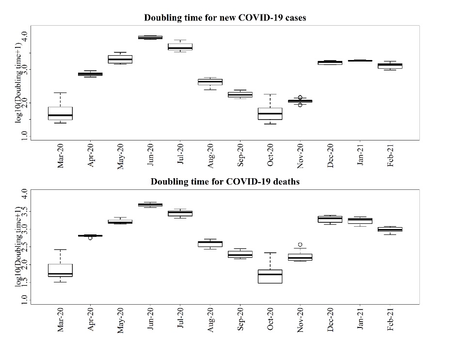 The boxplot for monthly doubling time for daily confirmed new COVID-19 cases and deaths from March, 2020 to February, 2021 in Bangladesh. The bottom and top of the box indicate the first and third quartiles value; the band inside the box is the median days.