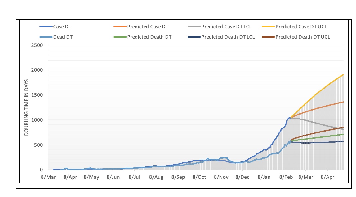 Two months (15 February to 15 April 2021) prediction of doubling time for daily confirmed new COVID-19 cases and deaths in Bangladesh.