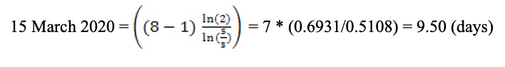 In Bangladesh, the first COVID-19 positive case was detected on 8 March 2020. A total of 3 cases were detected on that day. On 15 March, 2020, seven days from the first case identification, the total number of cases were 5. So according to the formula, if we calculate the case doubling time for 15 March, our t1 would be 1, t2 would be 8, c1 would be 3, and c2 would be 5.