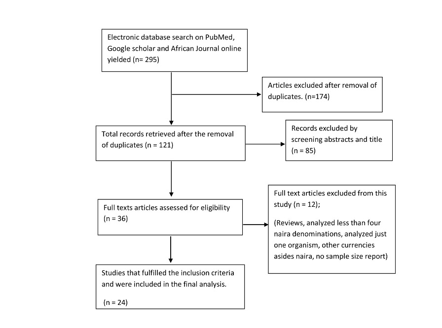 Databases such as MEDLINE (via PubMed), Google scholar, and African Journals Online (AJOL) were searched for eligible articles for this study. A combination of words such as “Naira notes”, “naira notes”, “microbial contamination”, “Parasitic contamination”, “Public health risks”, “Nigerian paper currency” was used during the search. A supplementary literature search was also carried out using the reference list of the eligible articles. The literature search was carried out independently by two authors (O. Q. O and J. D. S). The last search date was 28/07/2020.
