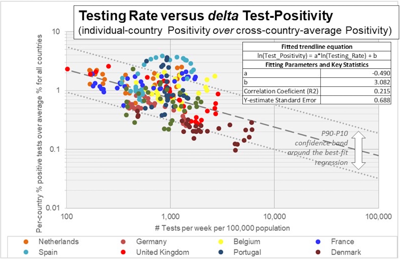 A weighted average of Test Positivity across all countries was computed and used to quantify the differences in Test Positivity in different countries, over time and relative to cross-country trend. Differences in test-selectivity “bias” due to different Testing Rate are certainly a contributing factor to the observed differences in Test Positivity between countries, although other factors such as differences in testing protocol and of course genuine differences in the spread of COVID-19 amongst the population, will also play a role. To demonstrate this, Figure 1 cross-plotted the difference between individual-country Test Positivity and the cross-country-average Test Positivity, against Testing Rate. Note that the difference is expressed as a ratio (i.e., the Y-axis of Figure 1 shows individual-country Test Positivity over cross-country-average Test Positivity). As expected, there is a clear trend of decreasing Test Positivity with increased Testing Rate. A best-fit relationship was computed through regression analysis as shown in Figure 1. Given there are many other factors that may influence the difference in test Positivity between countries and hence it cannot be expected that all differences are explained by Testing Rate, the author considered the observed Correlation Coefficient (R2) of 0.215 as statistically significant.