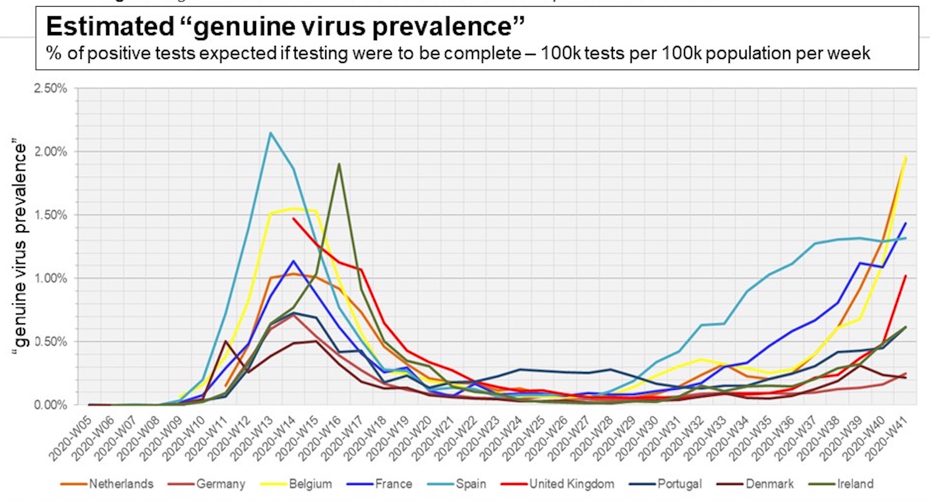 The “genuine Viral Prevalence” curves for the studied European countries consistently show a two “waves” pattern (Figure 1) with a 1st epidemic “wave” in week 10 to week 20 and a 2nd “wave” from about week 34 onward. “Genuine Virus Prevalence” for the 2nd “wave” to date is approaching similar levels as during the peak of the 1st “wave”. This means that the higher number of confirmed COVID-19 Cases in the ongoing 2nd “wave” (depending on the country, 2 to 3 times the cases count during the 1st “wave”) is entirely the effect of improved cases detection due to increased Testing Rate.