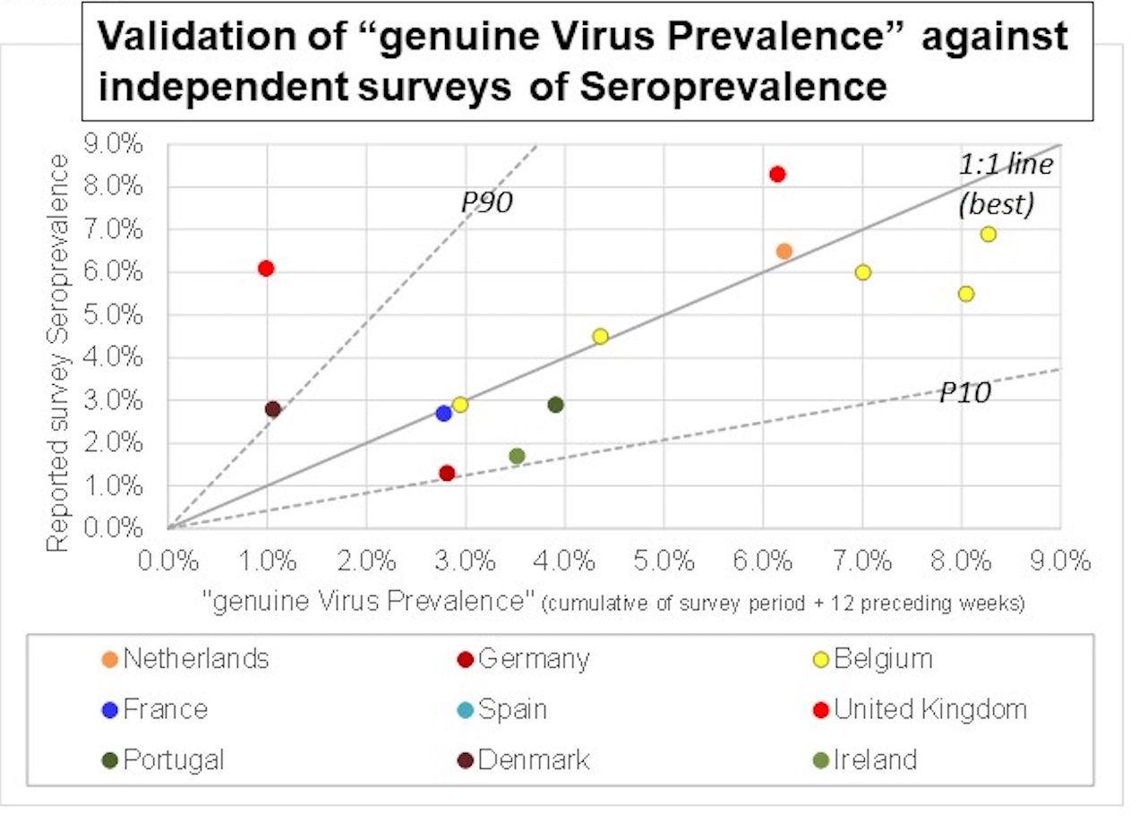 To validate the estimates of “genuine Virus Prevalence”, they were compared against available estimates of COVID-19 Seroprevalence for the studied countries, mostly from blood plasma studies (6, 7, 8, 9, 10, 11, 12, 13, 14). The difference in reporting period needs to be taken into consideration. Whilst “genuine Virus Prevalence” is like an “instantaneous” measure of virus prevalence as it is based on active infections seen by PCR testing, Seroprevalence data reflects an antibody response to either active or historic infections that may date back several months (15). In this paper, it is assumed that the average antibody residence time is about three months (12 weeks). Therefore, for each Seroprevalence report, the cumulative “genuine Virus Prevalence” within the 12 weeks up to the Seroprevalence reporting date is computed and reflected against the Seroprevalence percentage. In case of Seroprevalence studies where sampling was done over several weeks, the average of “genuine Virus Prevalence” over those weeks was used.