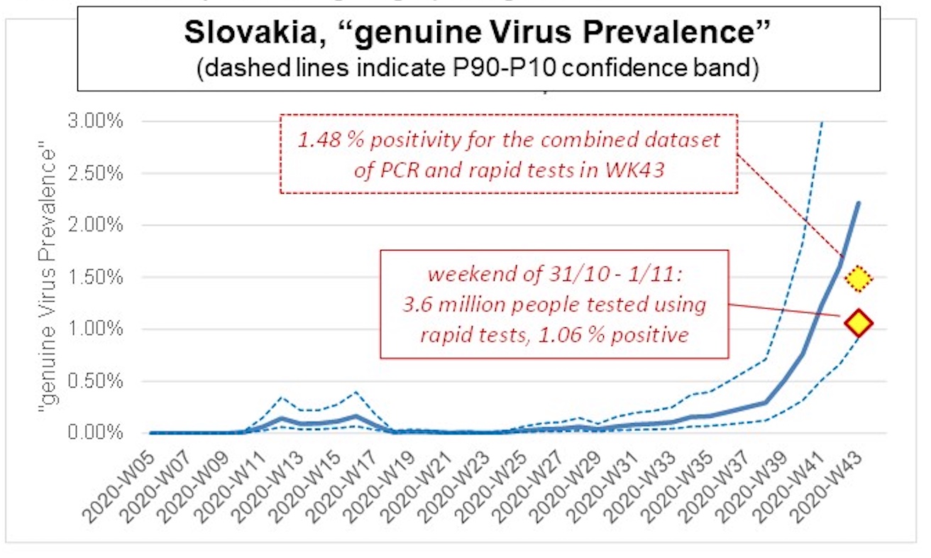 "genuine Virus Prevalence" estimated for Slovakia, compared against results of recent community mass-testing using rapid antigen method.